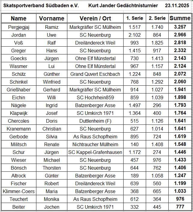 Am 23. November fand im ‚Warteck‘ in Müllheim-Niederweiler das KJG statt. Insgesamt spielten 24 TeilnehmerInnen mit, eine(r) mehr als im Vorjahr. Nach 2 spannenden Serien ohne jeden Zwischenfall standen die Sieger fest.
