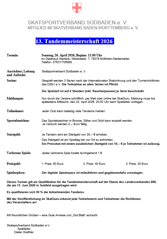 Am Sonntag den 26. April 2026 findet die 13. Südbadische Tandemmeisterschaft im ‚Warteck‘ in Müllheim-Niederweiler statt.